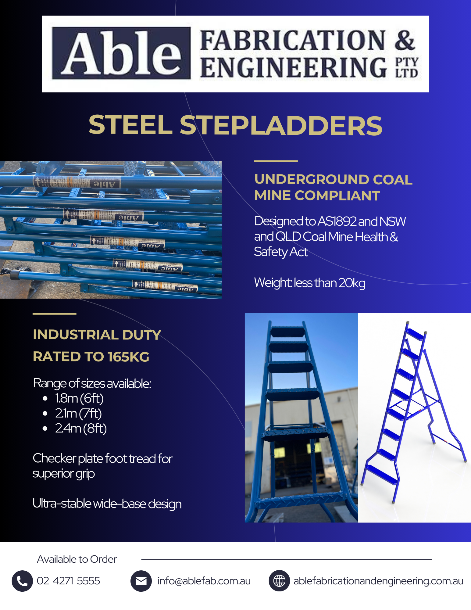At Able Fabrication & Engineering, we’re a trusted name in the industry, delivering high-quality solutions that meet stringent standards. Our underground step ladder is expertly designed, fabricated, and welded to comply with Australian Standard AS/NZS 1892.1:2018 (Portable Ladders, Part 1: Metal) and underground coal mining specifications.